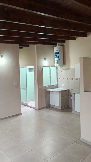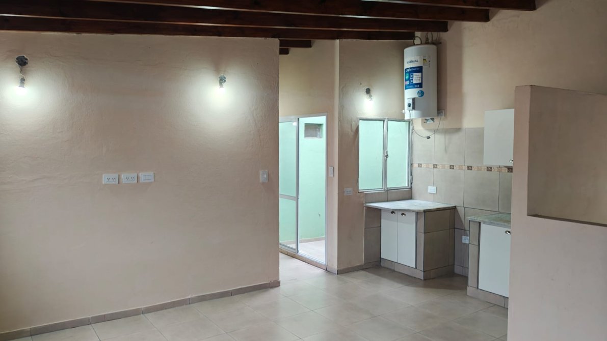 Estar-Comedor amplio de 5,30 x 5 metros, con cocina integrada, mueble bajo mesada y termoeléctrico. Posee doble ventana con rejas y acceso al resto de los ambientes mediante pasillo distribuidor. Cielorraso con vigas de madera a la vista.